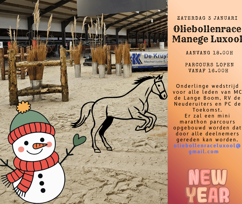 Aankomende zaterdag 3 januari verrijden we weer de Oliebollenrace. Kom gezellig langs, het word oergezellig. We starten om 18.00h met de pony's, gevolgd door de paarden en sluiten af met de menners. Vanaf 19.30h is tevens onze nieuwjaarsborrel!